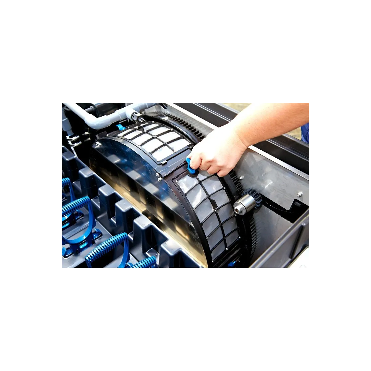 Elementy bębna są tak zaprojektowane że nawet najbardziej uciążliwe glony nitkowate pompowane z oczka wodnego do komory filtra nie stanowią dla bębna żadnego problemu dzieje się tak dzięki elementom zgrabiającym glony z wody a dzięki ciśnieniu wody płuczącej usuwane są poza filtr.