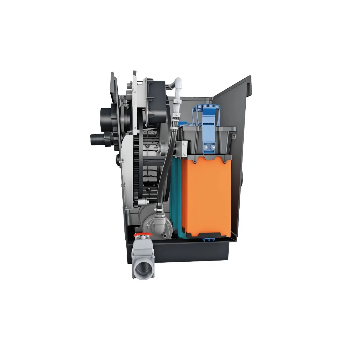Wysoko wydajna ciśnieniowa pompa płucząca doskonale sprawdza się w trakcie płukania sit bębna. Pompa spłukuje wszystkie zanieczyszczenia dzięki dyszy dodatkowo pompa jest wyposażona w odpowiednio dobrany element wibroizolacyjny dzięki czemu jest praktycznie bezgłośna.