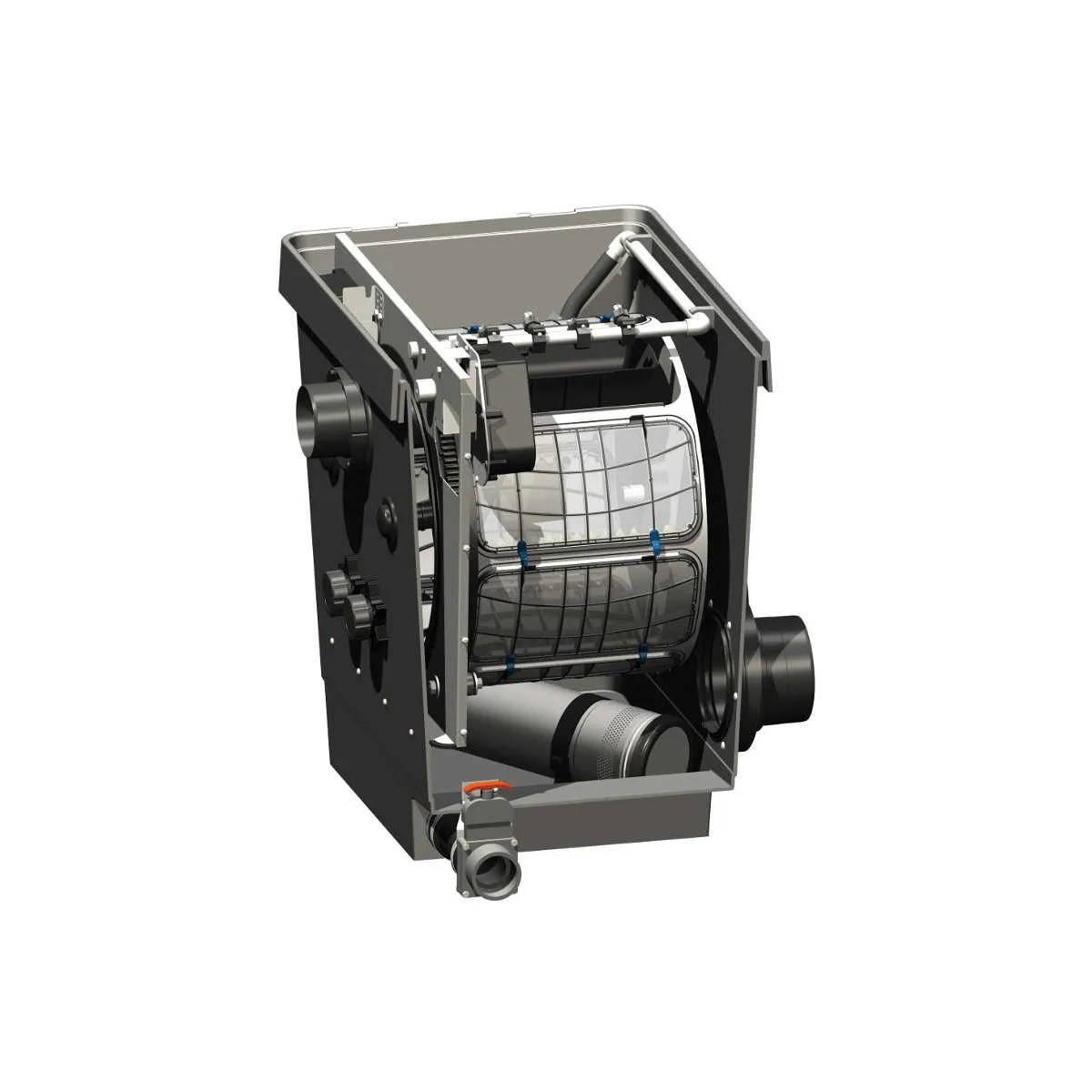 Pierwszym i najważniejszym z nich jest separator zanieczyszczeń stałych zawieszonych w wodzie płynącej z naszego stawu kąpielowego lub dużego oczka wodnego. Separatorem tym jest właśnie moduł bębnowy woda wpływa do bębna wykonanego ze stali nierdzewnej. Bęben modułu proficlear premium Oase posiada wymienne sita filtracyjne wykonane z siatki o wielkości oczek 60 mikronów pomimo tak maleńkich oczek siatki przez filtr może przepłynąć nawet 25000 l/h wody.