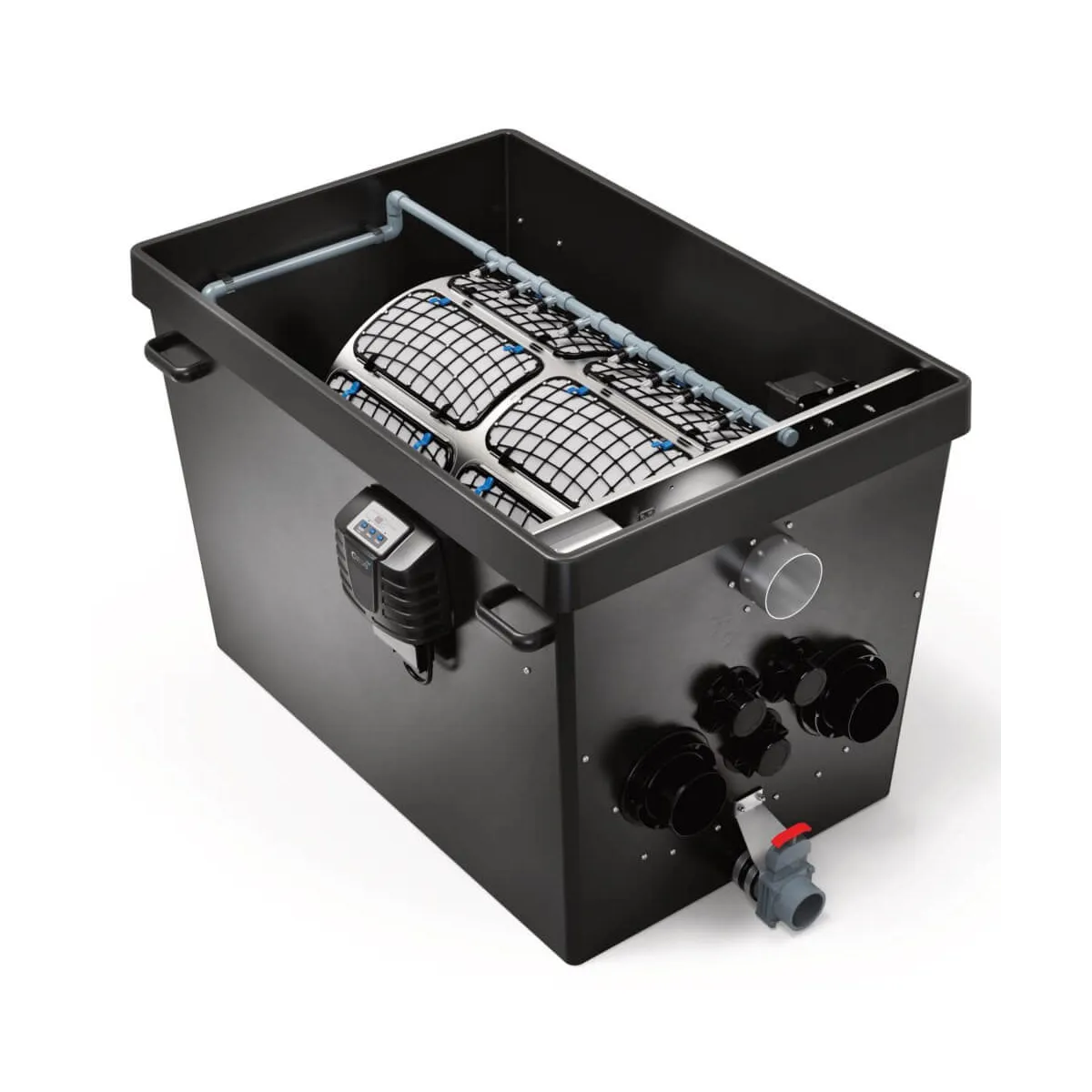 Filtr bębnowy ProfiClear Premium XL ma za zadanie separację większych zanieczyszczeń na sitach (60 μm), zanim woda przepłynie do części biologicznej filtra. W wyniku oddzielenia frakcji stałej z wody usuwamy elementy, które na skutek rozkładu biologicznego wzbogacałyby wodę w substancji pokarmowych. Działanie modułu bębnowego jest więc bardzo ważne do wspomagania biologii filtra w module Moving Bed oraz w module odpływu. Maksymalna wydajność cyrkulacji w systemie filtrów wynosi 50000 l/h w przypadku układu z pompą cyrkulacyjną, natomiast 66000 l/h w przypadku układu grawitacyjnego. Proces filtracji jest sterowany i kontrolowany automatycznie przez układ sterowania ze zintegrowanym mikroprocesorem. Automatyczne samooczyszczanie można przy tym indywidualnie dopasować do potrzeb.